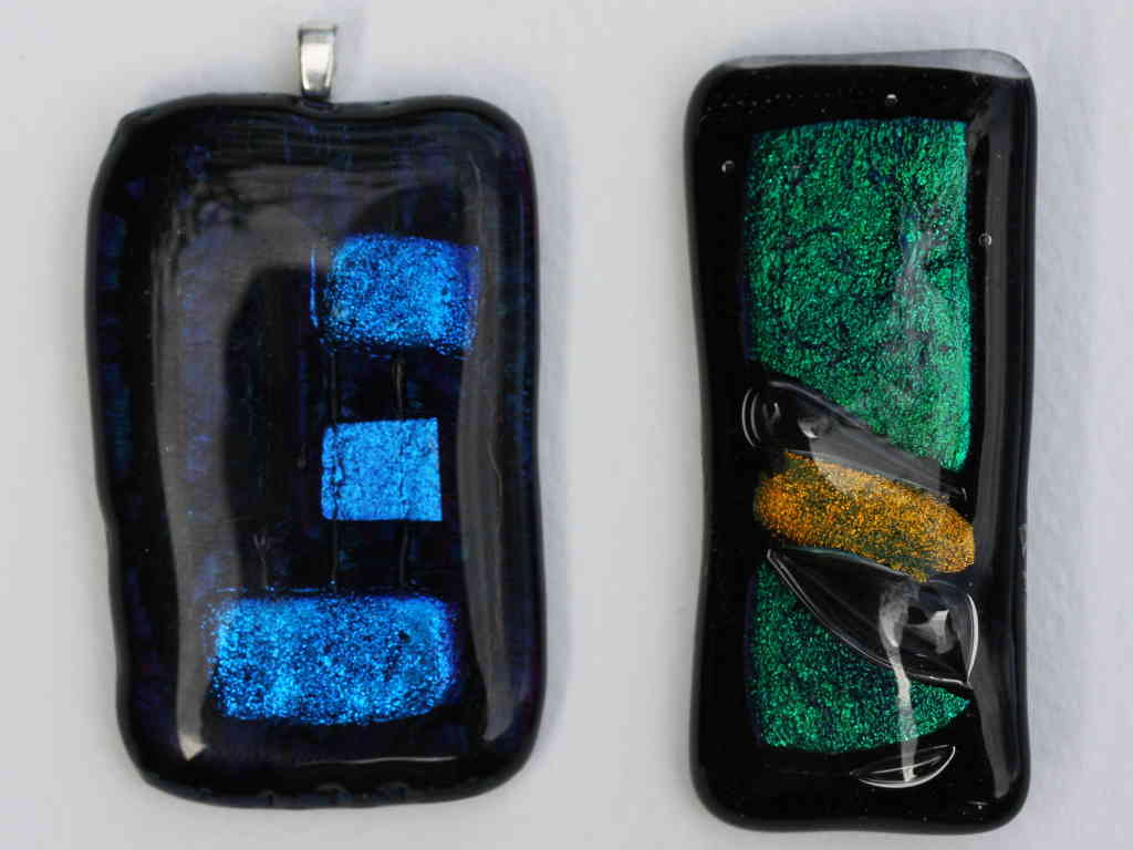 Here we have a pair of Dichroic Glass pendants. The colours in Dichroic Glass result from the interference between the light and the material structure and as a result the colours are very pure and bright, metallic in nature.
