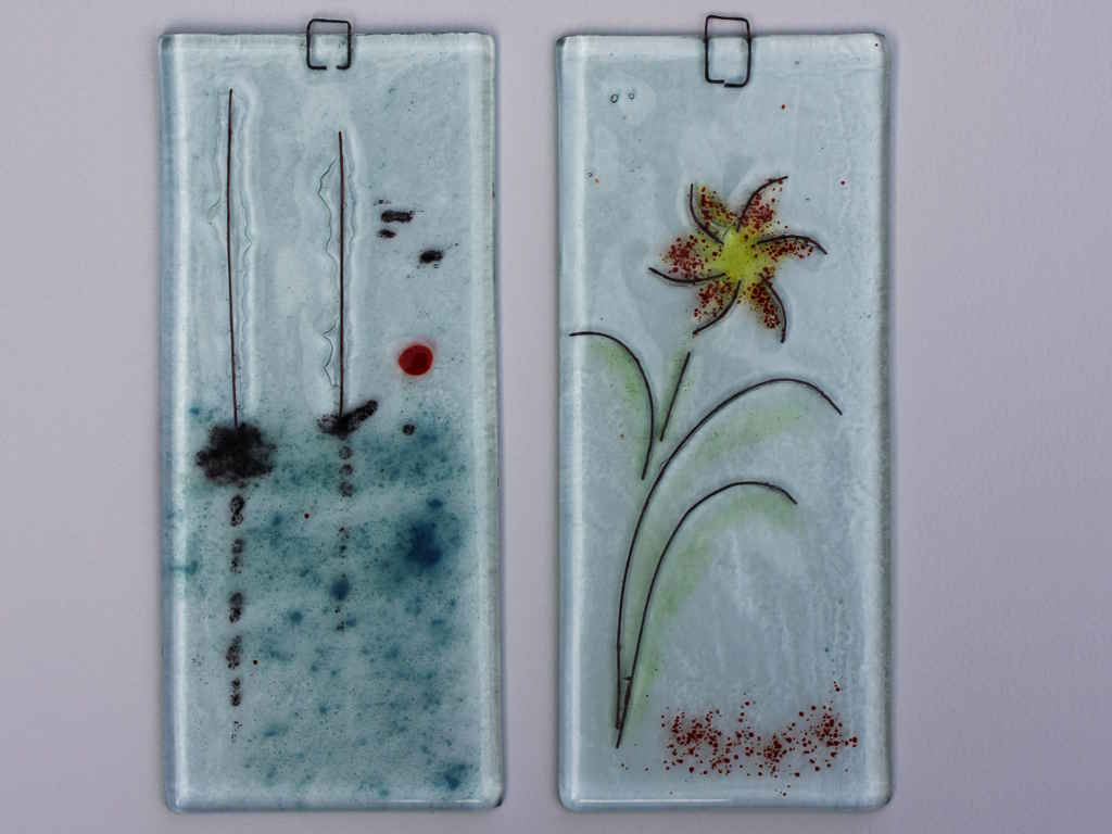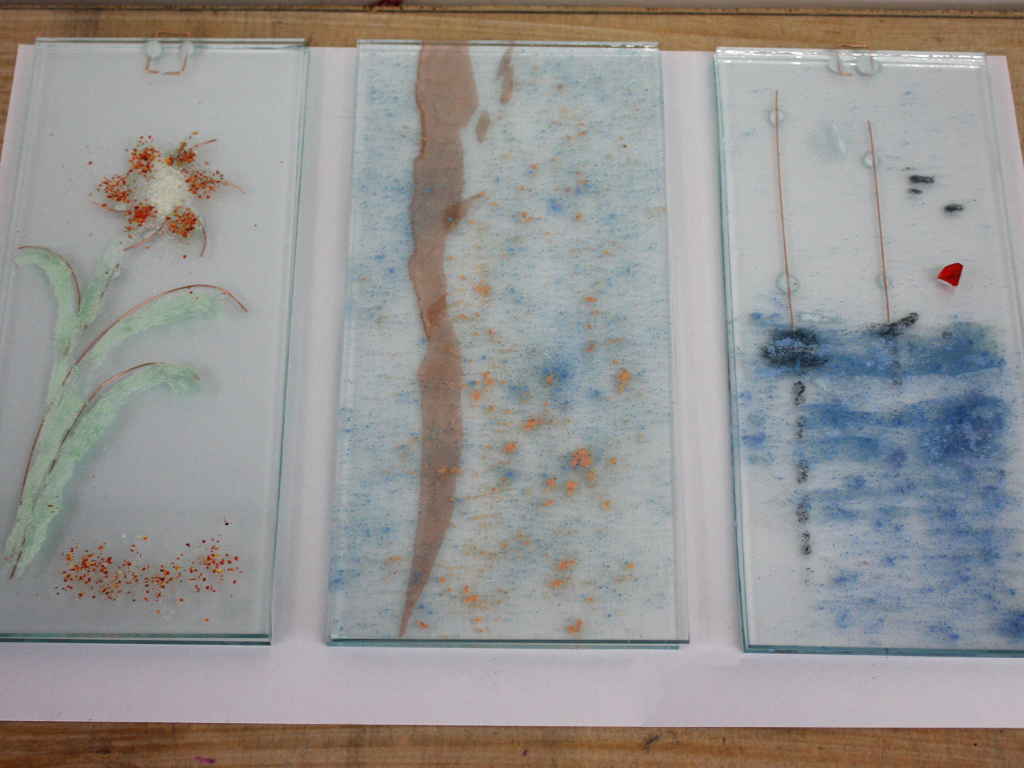 The plaques post firing and here I will point out some of the features of kiln fired glass.