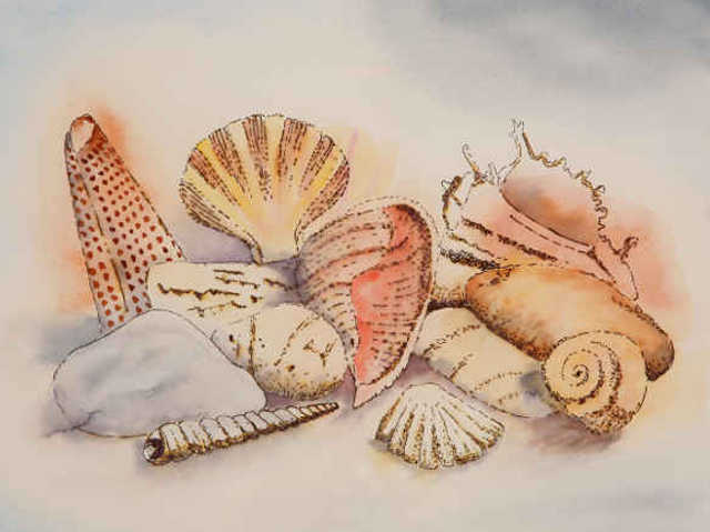 An exercise in pen and watercolours grew into so much more. This is one of those pictures where the image takes over and you really are not sure where you are going. I started by laying down some loose colours and then drew in the pen detail and finally added the shading and shadow to give depth and ground the shells. However, the result is very pleasing and the original has been stolen by my wife.