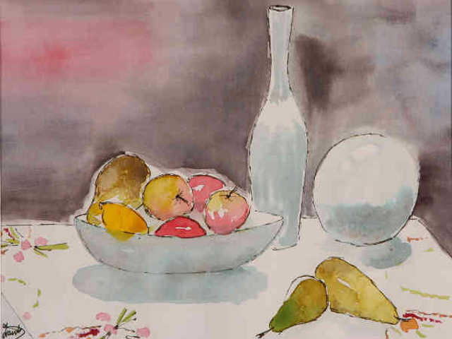 I started to paint this classic still life in a rather unconventional manor by painting the shadows. I did this because white objects are very difficult and I was focused on capturing the form and not the detail. Once the basic shapes were outlined I added the colours and finally drew in the shapes with a pen. The result is looser than many of my pictures but I am very happy with the result.