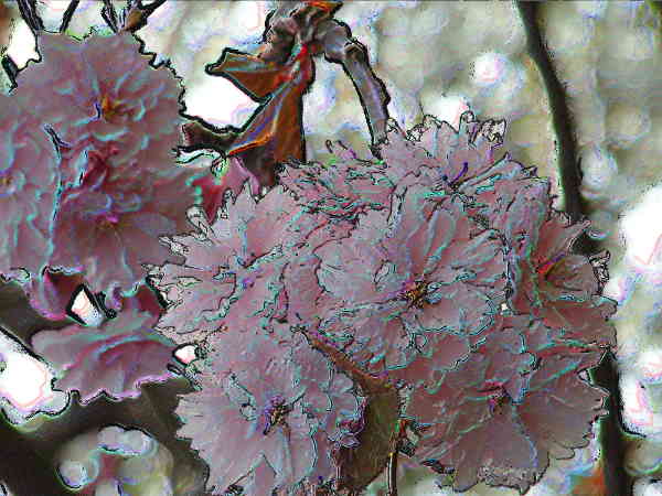 Cherry Blossom is a very full on experience a riot of pink and pink and in your face. However, in a photograph the edges of the blossom are often lost in the riot of colour and the edges are in my opinion more interesting. So hours latter and I have a picture that leaves the pinks ihn place but brings forward the edges in a pleasing way. I love it!