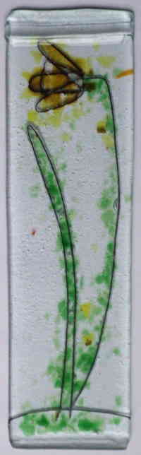 The daffodil to the left is a window hanging and is made from two layers of clear glass with copper wire and coloured glass flakes trapped between. The style is intentionally very primitive in this medium less is defiantly more, the fussier you get the more likely you are to have a disaster. It looks wonderful when the sun shines through it but I think it would have been better if the wire was thinner as it is just a little too heavy.