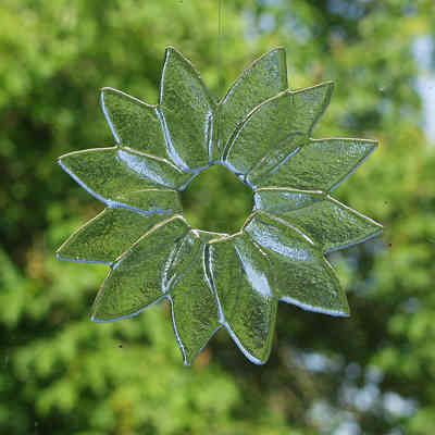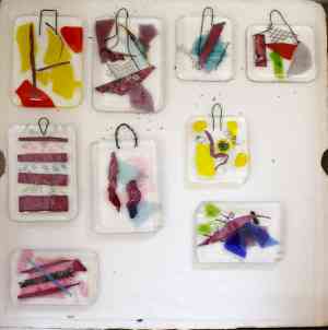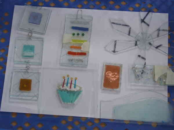 Finally, Cathy’s clear glass flower hanging in front of a window, wonderful! Below is a picture of some of Cath‘s work before it was fired and the magic happens.