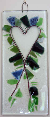 The piece with the heart started off as a bent bit of wire and a question from Cathy. “What do I do with this?” The simple suggestion to surround it with some coloured glass came in response and because wire cannot be fused to the surface but must be trapped, two layers of clear glass and a really nice wall plaque or window dangler is the result. To give you an idea of the scale this is about 60mm across, so much bigger.