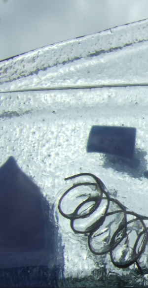 The photograph to the right is of a small part of a mirror surround which works incredibly well but add mirror to glass and for me at least it is impossible to get a good picture so sorry only some detail but what detail. The flakes of opaque dark blue glass appear to float above a textured surface, the glass is in multiple thicknesses and coil of copper wire has again trapped many small bubbles the eye does not know where to settle, wonderful.