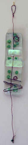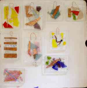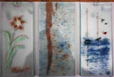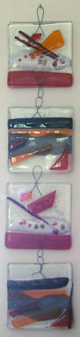 The wall hanging to the left here is made from four separate squares of fused glass. Each is attached to the next by a small wire which is fused between the two outer layers of glass. The coloured pattern is made by laying and layering small pieces of glass or other objects between the two outer layers.