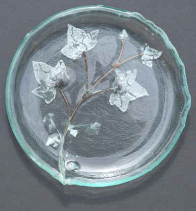 Finally, the plate below is made from two layers of glass trapping Ivy leaves and some copper wire. Again this is a somewhat random process the leaves oxidise and leave a shadow.