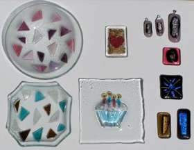 This little montage shows bits of Bullseye and Dichroic Glass and a few piece of jewellery made for the material. The transformation that takes place during firing is almost magical, get the colour combination right and the dichroic glass transforms an interesting piece into something wonderful.